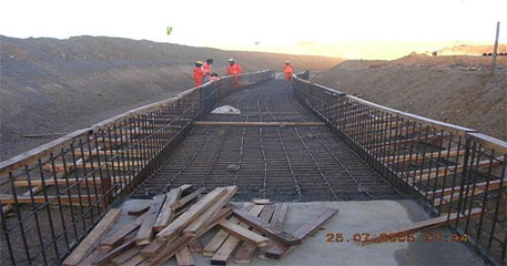 Construcción del plinto de 500 m3 de concreto de alta resistencia, fabricados en campo mediante una Planta Volumétrica construida por Geos Ingenieros y vaciada en sólo tres días.